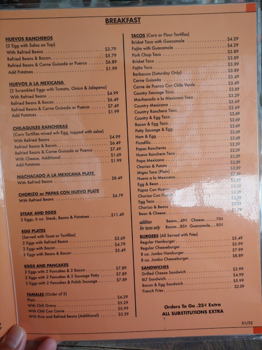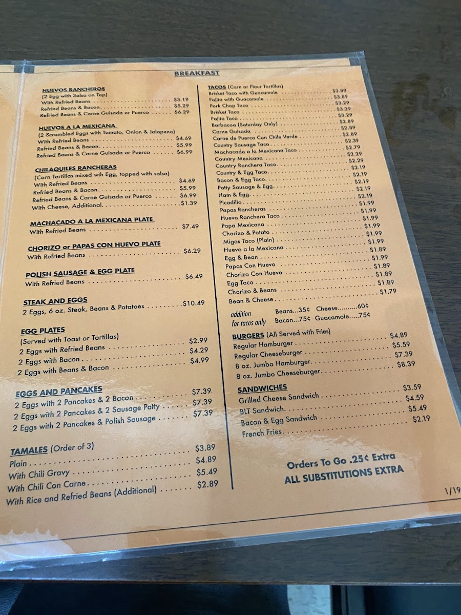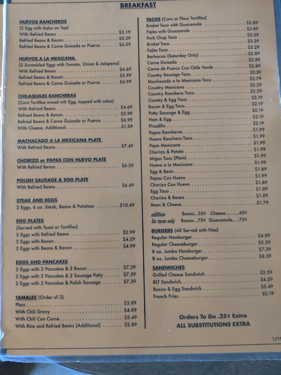 Very small, BUT GREAT RESTAURANT! There's usually a wait, but it generally moves along well and is definitely worth the wait. I've tried the pork carne Guisada, brisket taco with Avacado, enchilada plate, and fideo Loco. These dishes were on 2 different visits. The wait staff is nice and very attentive. I'll definitely be returning again.